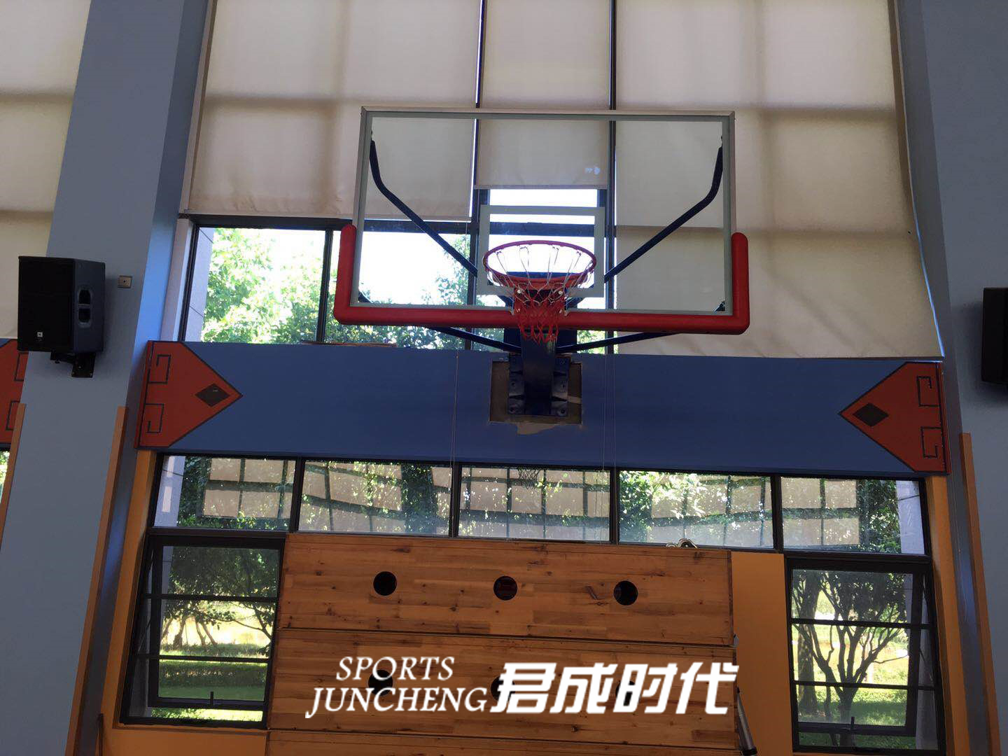 2.篮板:国家标准(规格:1800*1050mm)安全防爆钢化玻璃篮球板,采用铝合金包边技术,配高档进口胶条。 与篮球架连接为5个支撑点